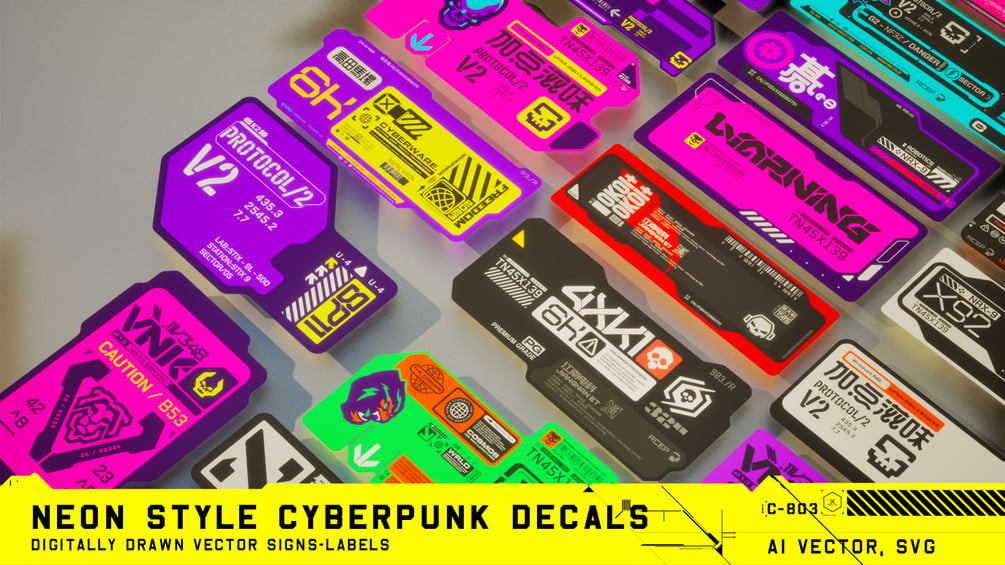 A versatile and comprehensive set of vector decals ready to be used as scifi/cyberpunk labels for any kind of 2d/3d concept art.This pack includes anything from labels to sticker and shop signs which is perfect for both architectural concept art and 3d props alike, so you can easily add an in-world branding to your concepts while having a consistent visual style.