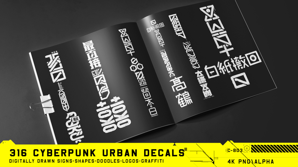 Crafted with precision, each decal is digitally drawn, ensuring an organic look and feel that seamlessly integrates into your artwork. At an impressive 4k resolution, these high-resolution decals bring every cyberpunk-inspired element to life, immersing your audience in a thrilling urban landscape.
